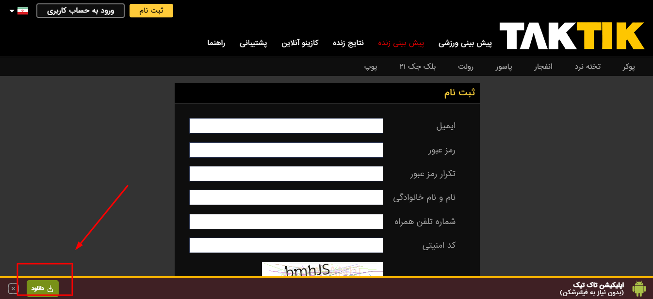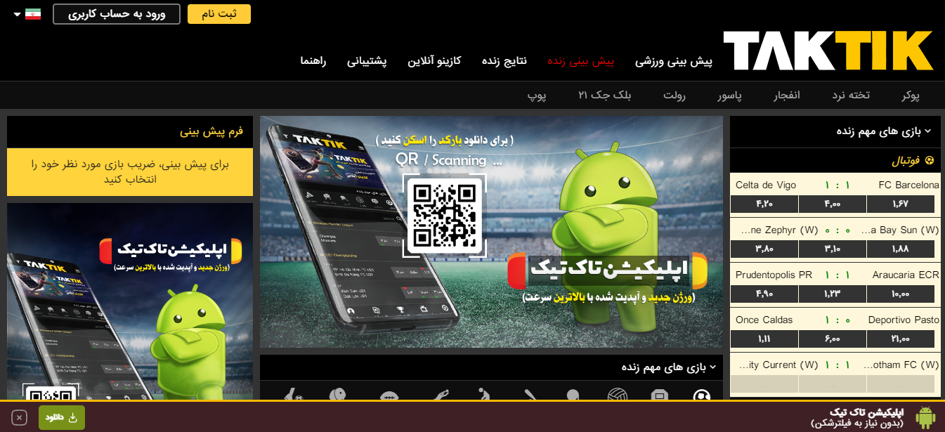 سایت taktik به عنوان یکی از شناخته شده ترین پلتفرم های شرط بندی فارسی، امکانات گسترده ای در زمینه پیش بینی ورزشی و بازی های آنلاین ارائه می دهد. ضرایب دقیق و رقابتی، پوشش کامل مسابقات فوتبال، بسکتبال، تنیس و رشته های محبوب دیگر از ویژگی های اصلی آن است. در بخش کازینو آنلاین tak tik، بازی های پرطرفدار مانند پوکر، رولت، بلک جک، اسلات و انفجار با کیفیت بالا در دسترس کاربران قرار دارد.
