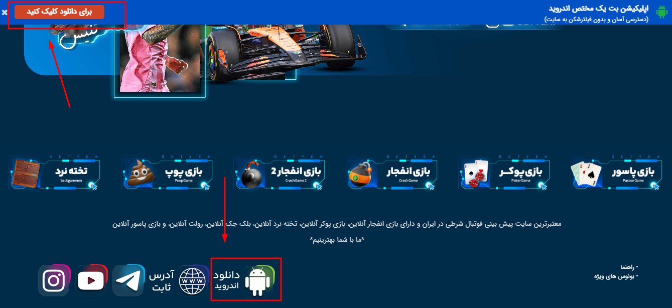 روش‌ های دانلود برنامه بت یک بسیار آسان است؛ کاربران می‌ توانند از طریق دکمه‌ های دانلود موجود در بالای سایت یا کانال تلگرام ما به صورت مستقیم و بدون نیاز به فیلترشکن به برنامه دسترسی پیدا کنند. این ویژگی‌ ها باعث شده است تا این اپلیکیشن به یکی از گزینه‌ های محبوب در بین طرفداران شرط‌ بندی تبدیل شود.